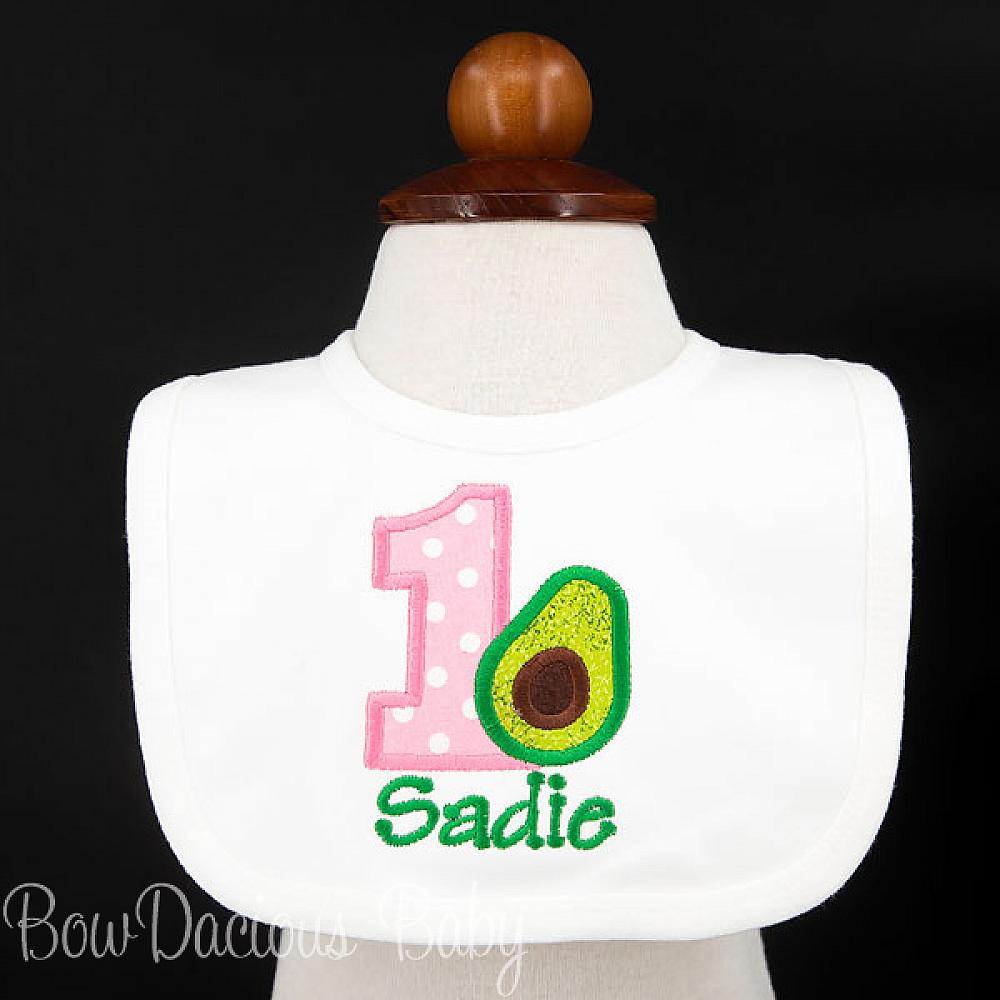 Personalized avocado bib. Custom made to your specifications. You pick the fabric, font, and thread colors. Add shorts, pants, a coordinating shirt or diaper cover to complete the outfit.