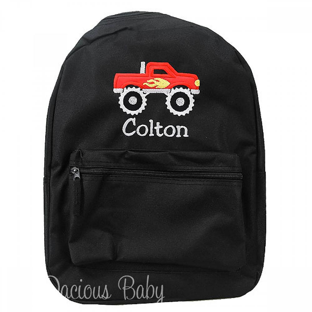 Personalized boys monster truck backpack. Custom made to your specifications. You pick the font and thread colors.