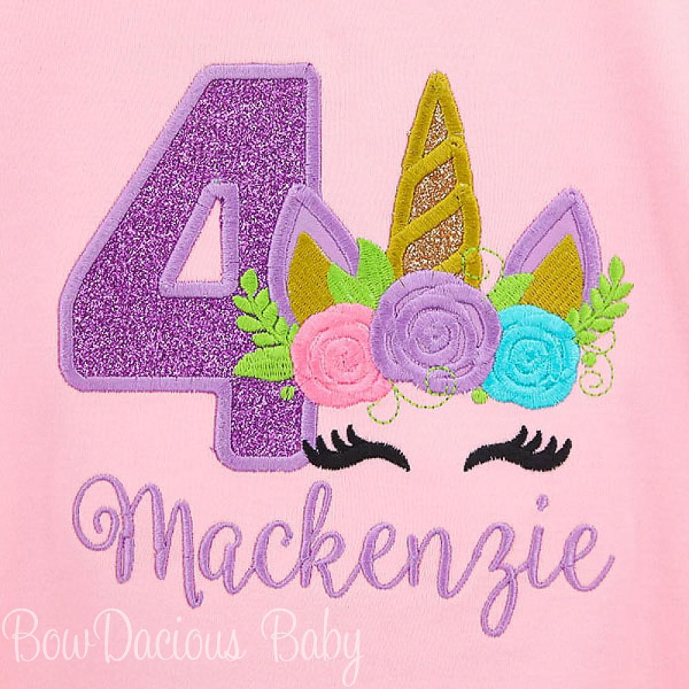 Custom monogrammed girls unicorn birthday dress. Custom made to your specifications. You pick the fabric, font, and thread colors. Add shorts, pants, a coordinating bib or diaper cover to complete the outfit.