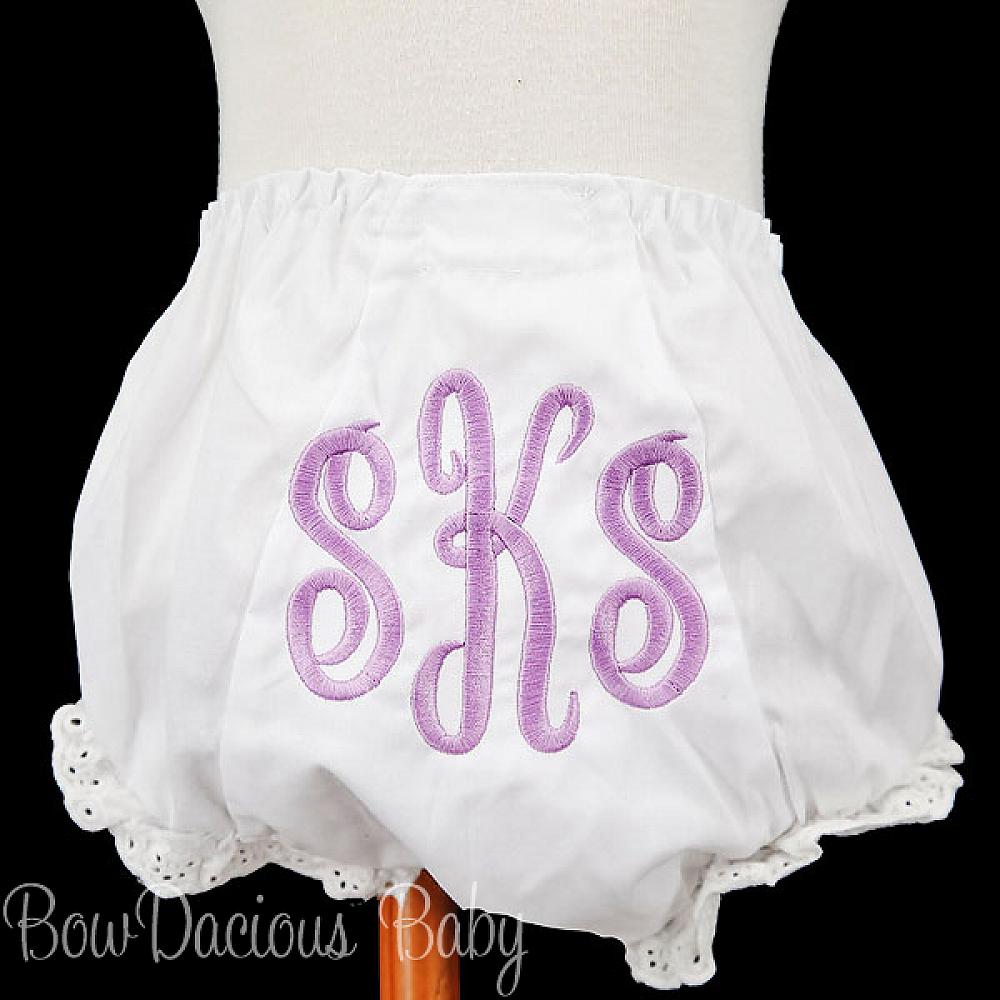 Custom monogrammed baby bloomers. Made to your specifications. You pick the font and thread color.